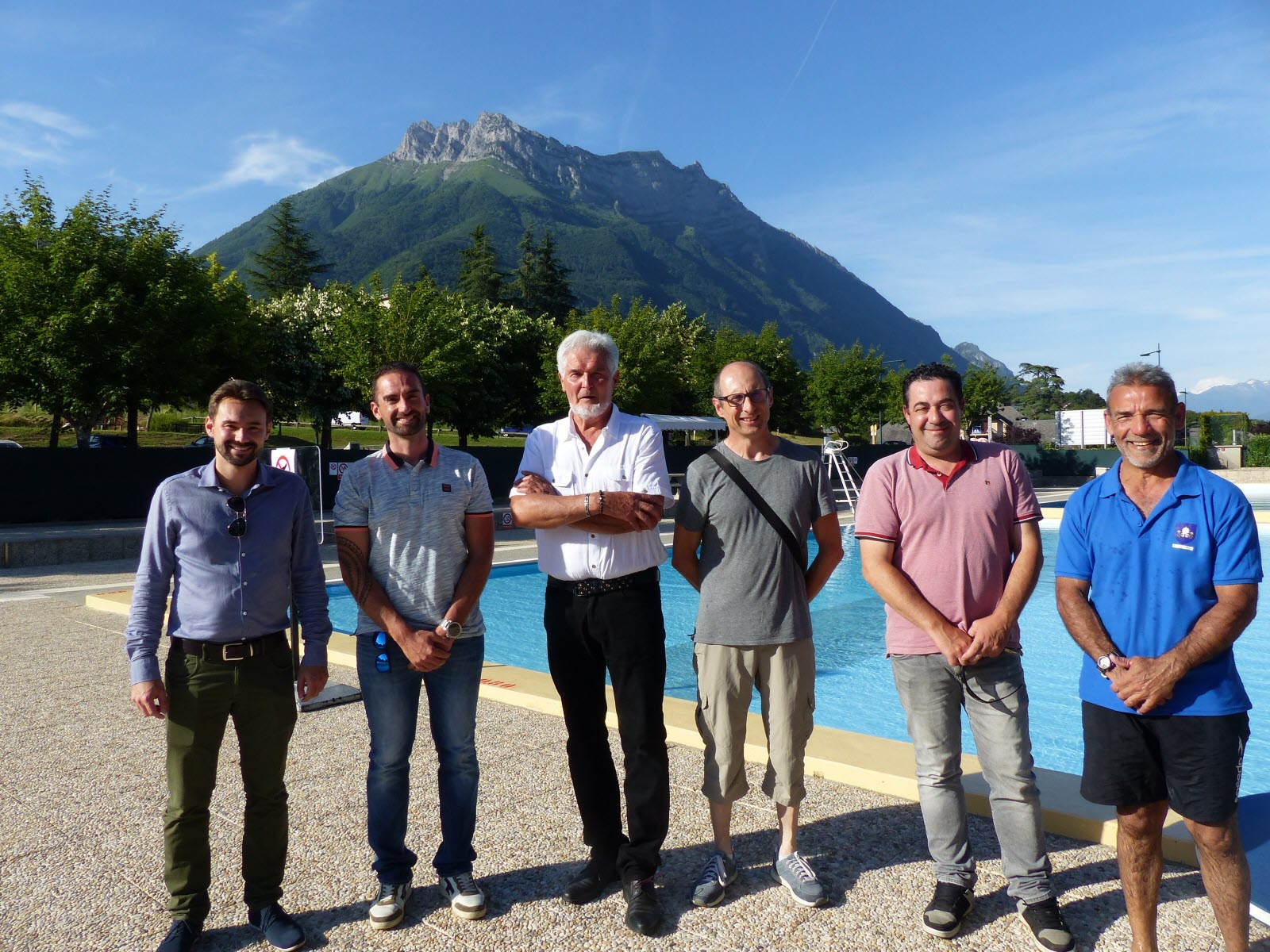 De gauche à droite : Julien COINTY - Adjoint-DGS, Jonathan REQUET-MORAT-Responsable des services techniques, Michel BOUVIER-Maire, Frédéric PACCALET - Adjoint aux travaux, Grégory ESPAGNOL - Chargé de projets et travaux, Rabah BAALI - MNS
